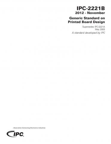 IPC-2221B is the foundation design standard for all documents in the IPC-2220 series. It establishes the generic requirements for the design of printed boards and other forms of component mounting or interconnecting structures, whether single-sided, double-sided or multilayer. Among the many updates to Revision B are new criteria for conductor characteristics, surface finishes, via protection, board electrical test, dielectric properties, board housings, thermal stress, compliant pins, panelization and internal and external foil thicknesses. Appendix A provides new test coupon designs used for lot acceptance and quality conformance testing.