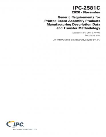 The IPC-2581C standard specifies the XML schema that represents the intelligent data file format used to describe printed board and printed board assembly products with details sufficient for tooling, manufacturing, assembly, and inspection requirements.