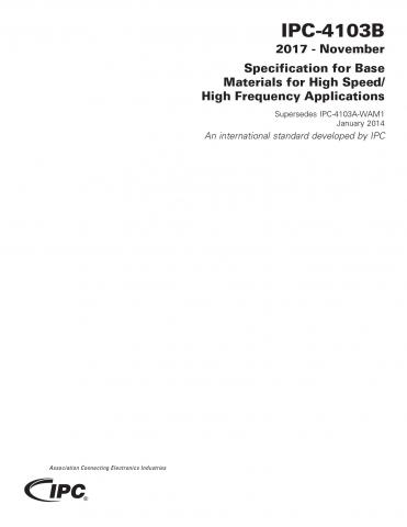 IPC-4103B standard covers the requirements for clad and unclad plastic laminate and bonding layer materials to be used for the fabrication of printed boards for microstrip, stripline and high speed digital electrical and electronic circuits. In addition to better definitions of inclusions and how to properly classify them; redefine "substrates" as, "fabricated sheets"; and a more proper definition of thermal conductivity of laminates and bonding material, IPC-4103B also allows the use of low permittivity (dielectric constant) glass reinforcements for laminates and bonding materials, thus improving both the permittivity and loss tangent properties of the materials conforming to this specification.