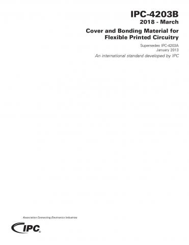 IPC-4203B establishes the classification system, the qualification and quality conformance requirements for dielectric films coated with an adhesive on one or both sides, which are to be used as cover material and/or bondply for flexible printed circuitry, as well as supported or unsupported adhesive films to be used in the fabrication of flexible printed circuitry. IPC-4203B does not cover non-flexible adhesives designed to be used in the rigid board areas of rigid flex constructions, which are covered in IPC-4101. Materials such as liquid-applied covercoat (see 3.1.8.3) are covered in IPC-SM-840 and are excluded from this document. 38 pages.