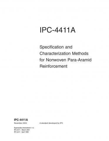 Covers the nomenclature, definitions and requirements for reinforcement made from nonwoven para-aramid fibers. Para-aramid reinforcement is primarily used in PCBs for HDI and high speed/high frequency applications. IPC-4411A also includes specification sheets, which can be used when selecting and purchasing nonwoven para-aramid reinforcement. Includes the incorporation of 14 new nonwoven para-aramid reinforcement specification sheets and the deletion of four nonwoven para-aramid materials that are no longer commercially available. Due to a test method correction, all specification sheets have been updated. 22 pages. Released November 2003.
