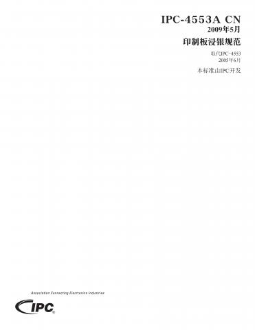 本规范基于性能标准规定了使用浸银作为印制板表面处理的要求。本规范适用于化学药水供应商、印制板制造商、电子制造服务业(EMS)、原始设备制造商(OEM)。浸银是在铜面上沉积一层薄的银。它是一种多功能的表面处理,适用于焊接。也可应用在一些挤入式接触和表面接触。它适合打铝线。浸银保护下面的铜面免受氧化,以超过预期的保存期限。暴露在湿气和诸如硫和氯的空气污染物中,可能给沉积层的使用寿命带来负面影响。这个影响可能会从轻微的变色到焊盘完全的变黑。适当的包装是必需的。注意:本标准,同时建立了对应位置上的单点厚度范围及浸银厚度的上限。共36页。2009年5月发布。2013年4月翻译。