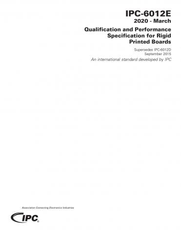 IPC-6012E specification covers qualification and performance of rigid printed boards, including single-sided, double-sided, with or without plated-through holes, multilayer with or without blind/buried vias and metal core boards. It addresses final finish and surface plating coating requirements, conductors, holes/vias, frequency of acceptance testing and quality conformance as well as electrical, mechanical and environmental requirements. IPC-6012E incorporates many new and expanded requirements in areas such as back-drilled structures, alternative surface finishes, copper wrap plating, marking inks, solderability testing, plating overhang, microsection evaluation, thermal shock and performance-based testing for microvia structures. For use with IPC-6011. Supersedes IPC-6012D.