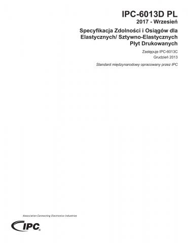 Dostarcza wymagań zdolności i osiągów dla elastycznych płyt drukowanych zaprojektowanych według IPC-2221 i IPC-2223. Elastyczna płyta drukowana może być jednostronna, dwustronna, wielowarstwowa lub sztywno-elastyczna wielowarstwowa. Wszystkie te konstrukcje mogą zawierać usztywniacze, metalizowane otwory PTH, mikrootwory przelotowe via i ślepe/zakryte otwory przelotowe via. Rewizja D wprowadza nowe i zaktualizowane wymagania dla wykończeń końcowych, stref przejścia ze sztywnych do elastycznych obszarów, anomalii deformacji, właczając w to zmarszczki, pofalowania oraz efekt słomki, znakowanie, wyrównanie (pierścień pola), zmniejszenia grubości przewodnika, usuwania dilektryka w otworach, rozmazania żywicy, mikrootworów wypełnionych miedzią oraz platerowanie selektywne (guzika) otworu. Wydane we wrześniu 2017. Przetłumaczone w sierpniu 2018.