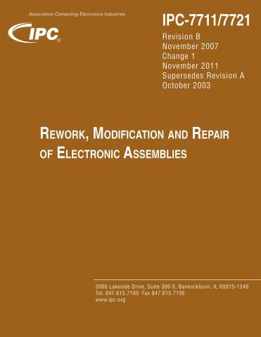 This guide includes everything needed for repair and rework of electronic assemblies and printed circuit boards. IPC-7711B/7721B Rework, Modification and Repair of Electronic Assemblies has received a complete procedure by procedure update to assure applicability to both lead free and traditional SnPb soldered assemblies. This single volume includes all previously published changes and several new procedures for BGAs (including reballing) and flex-print repair. Part 1 General Requirements has also been updated for ease of use and provides important direction and guidelines for all procedures. This section includes procedures common to rework, repair and modification. Part 2 is IPC-7711B and the procedures include tools, materials and methods to be used in removing and replacing surface mount and through-hole components. Part 3 is IPC-7721B and includes procedures for modifying assemblies and accomplishing laminate and conductor repairs. Many procedures have color illustrations to help the user understand the guide. Supersedes IPC-7711, IPC-7721 and IPC-R-700.