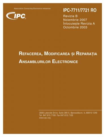 IPC-7711B/7721B Refacerea, Modificarea și Reparația Ansamblurilor Electronice a fost în mod total revizuit, procedură cu procedură, pentru a se asigura aplicabilitatea atât pentru ansamblurile lipite tradițional cu aliaje SnPb cât și pentru cele fără plumb. Acest unic volum include toate modificările anterior publicate și câteva proceduri noi pentru circuite BGA (inclusiv reatașarea de bile) și reparația de circuite imprimate flexibile. Partea 1 cu Cerințe Generale a fost de asemenea actualizată pentru ușurința utilizării și furnizarea de indicații și ghiduri importante pentru toate procedurile. Această secțiune include proceduri comune pentru refacere, reparație și modificare. Partea 2 este IPC-7711B cu proceduri care descriu materiale, scule și metode care sunt folosite în scoterea și reamplasarea de componente pe suprafață și cu terminale în găuri. Partea 3 este IPC-7721B cu proceduri care descriu modificarea ansamblurilor și îndeplinirea în mod corespunzător de reparații de laminat și trasee conductoare. Acest ghid este practic cuprins într-un biblioraft cu trei inele de prindere pentru ușurința adăugării de noi proceduri. Multe proceduri au ilustrații colorate pentru a ajuta utilizatorul în înțelegerea ghidului. Înlocuiește IPC-771(more...)