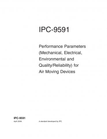 This document standardizes the performance parameters for air moving devices. The phrase "air moving device" (or "air mover") refers to equipment such as, fans, blowers and other forced air movement technologies. These air moving devices are used in the electronics industry for the cooling of heat-producing components, and range from small devices mounted directly to hot components such as microprocessor air moving devices, to larger devices used to force air through a chassis containing many heat dissipating components. This specification sets requirements for design, manufacture, and test application of air moving devices. The term "end user" as used in this document refers to the OEM or design/materials entity responsible for specifying the function and reliability of an air moving device in a final product application. 19 pages. Released April 2006.