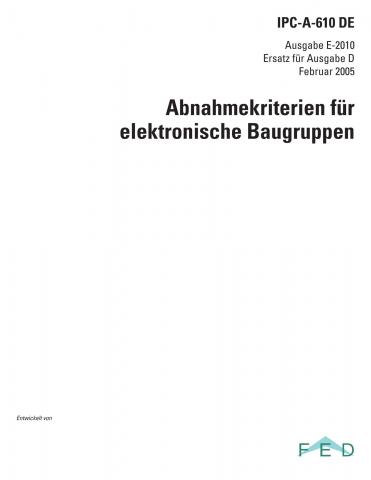 IPC-A-610 ist der meist benutzte Standard für elektronische Baugruppen weltweit. IPC-A-610E zeigt die von der Industrie akzeptierten Kriterien für die Verarbeitungsgüte von elektronischen Baugruppen mittels mehrfarbiger Fotos und Darstellungen und ist ein „Muss“ in jeder Fertigung und Qualitätssicherung. Insbesondere enthält sie Anforderungen und Abnahmekriterien für flexible Komponenten, Board-in-Board-Technologie, Package-on-Package-Technologie, bleifreie Fertigung, Ausrichtung von Bauteilen und Kriterien für das Löten in der Durchsteckmontage und SMD-Technik mit neuen, aktuellen Anschlussgeometrien und -technologien. Außerdem diskrete Anschlüsse und Drahtverbindungen, Montage von mechanischen Komponenten, Reinigung, Kennzeichnung, Beschichtung mit Lötstoppmaske und Conformal Coating sowie Anforderungen an Laminate und Leiterplatten.