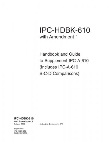 This handbook provides IPC-A-610 change history and cross reference support along with the previous Rev B to C content. IPC-HDBK-610 with Amendment 1 has summary listings of changes from Rev C to D and retains the original Rev B to C content. It offers explanatory and tutorial information to help with the understanding the requirements of IPC-A-610.