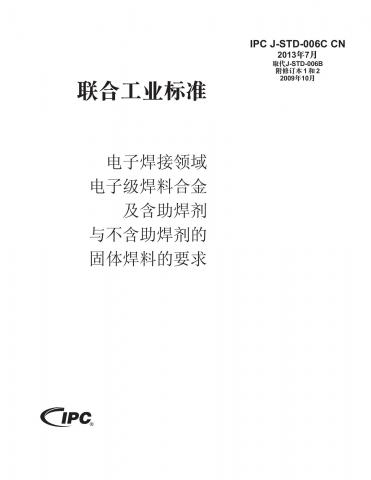 本标准规定了应用于电子焊接领域的电子级焊料合金、含助焊剂与不含助焊剂的棒状、带状、丝状、粉末状焊料及“专用”电子级焊料的命名原则、要求及测试方法。本标准是一个质量控制标准,无意直接关联制造工艺中材料的性能。对于应用于非电子领域的焊料,应该按照ASTM B-32的规定进行采购。本标准是三项联合工业标准之一,这三项联合工业标准规定了电子工业所用焊接材料的要求和测试方法。另外两项联合工业标准是IPC/EIA J-STD-004《助焊剂要求》和IPC/EIA J-STD-005《焊膏要求》。“C”版本已更新,主要阐述了有意添加到焊料合金中的金属成分和合金中的杂质问题。此外,表格和附录已经更新了最新的合金信息。共22页。2013年7月发布。2014年2月翻译。