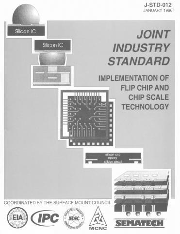 This informative document describes the implementation of flip chip and related chip scale semiconductor packaging technologies. The areas discussed include design considerations, assembly processes, technology choices, application and reliability data. Chip packaging variations include flip chip, HDI, micro BGA, micro SMT and SLICC. Also provides general information on implementing flip chip and chip scale technologies for creating multichip modules, I/C cards, memory cards and very dense surface mount assemblies. Developed by IPC, EIA, MCNC and Sematech. 113 Pages. Released January 1996.