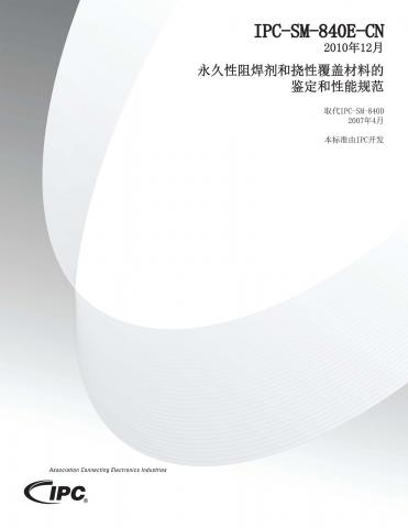 建立了液态和干膜阻焊材料的评估要求,以及确定其用在一个标准的印制板系统上的可接受性要求。IPC-SM-840提供了两个等级的要求,T级和H级,以反映基于行业/最终用户要求对功能性的要求及测试严格程度的差别。覆盖了附着力、材料鉴定、耐溶剂、以及电气要求。E版本包含了挠性覆盖材料的要求,在已蚀刻的导体和其他导电图形上提供挠性的介质保护层。共19页。2010年12月发布。2012年10月翻