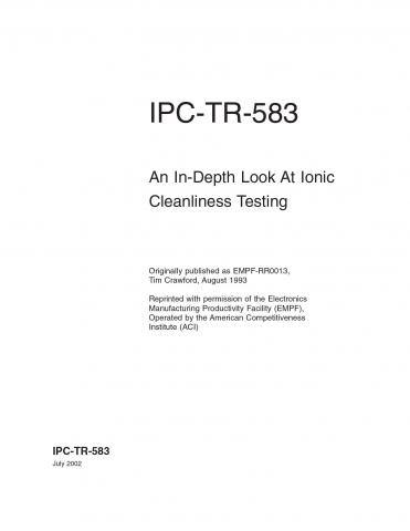This original research was a cooperative effort between the EMPF and IPC, released as EMPF-RR-0013 in 1993 for better understanding of ionic cleanliness testing. The IPC Ionic Conductivity/Ion Chromatography Test Task Group has validated its continued importance and relevance to the cleaning community and IPC-TR-583 is the result. It includes how solvent temperature influences the final cleanliness results, criticality of a 75% isopropyl to 25% water ratio, value of spraying the solvent, etc. The report provides quantified results to help users determine what variables most influence ionic cleanliness test results. 229 Pages. Released July 2002.